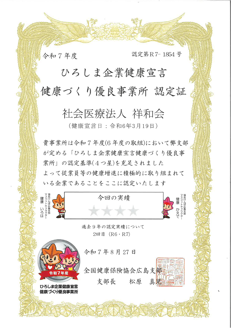 全国健康保険協会広島支部による「ひろしま企業健康宣言」にエントリーし、従業員の健康づくりに取り組んでいます。